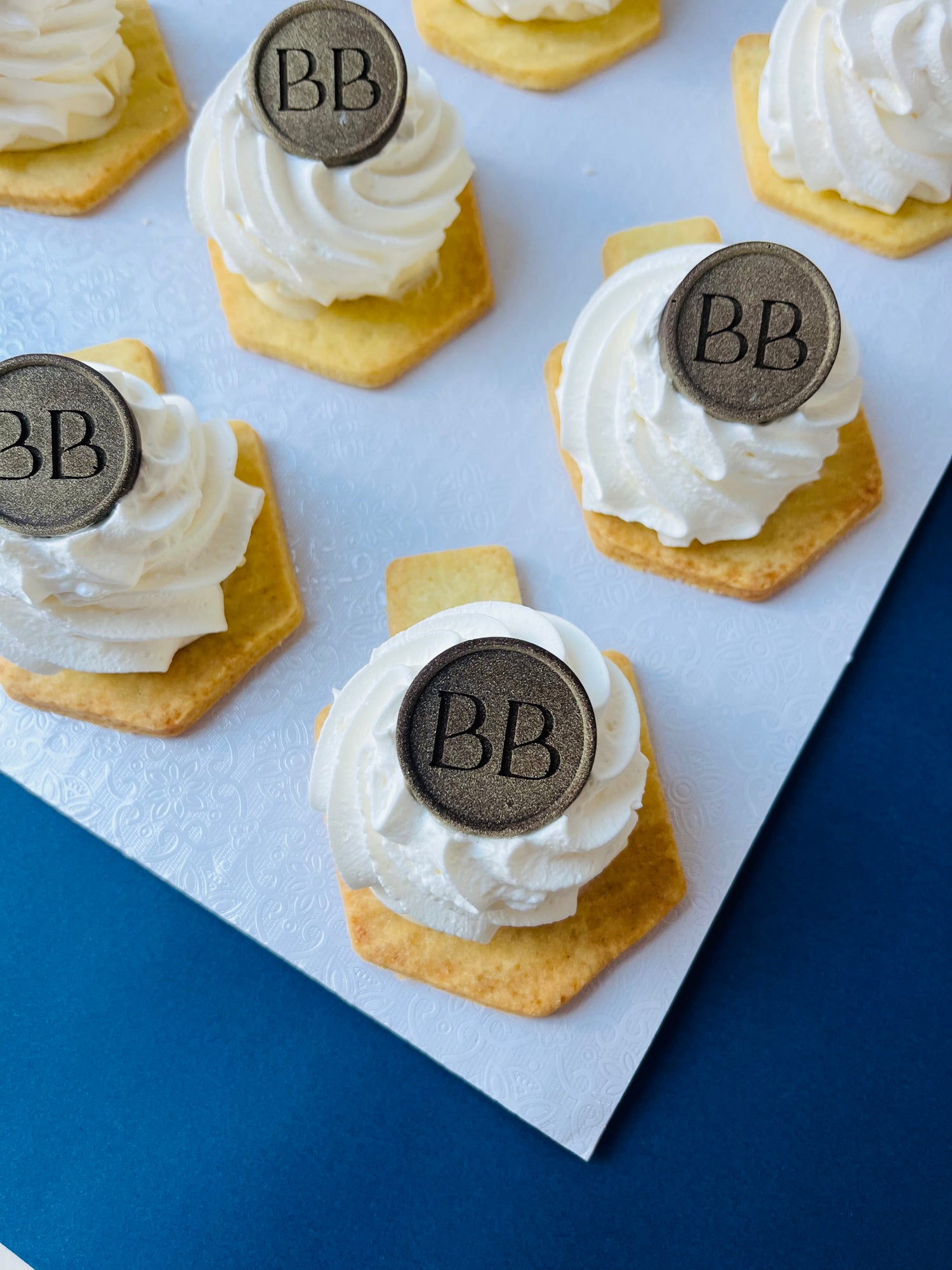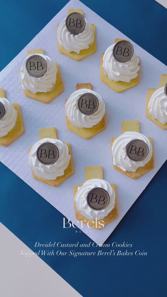 Dreidel Custard and Cream Cookies with Signature Berel’s Bakes Coin