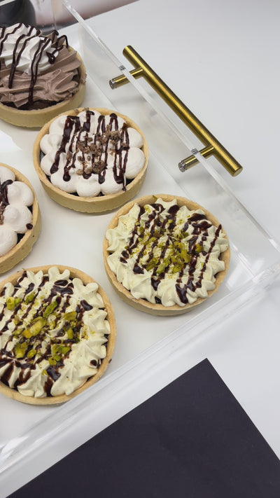 Indulge in our luxurious 12x16 clear acrylic tray featuring 12 beautifully crafted tarts—4 Halva, 4 Chocolate Dubai, and 4 Chocolate Mousse. Delicious and visually stunning, this gift tray makes a perfect treat for any occasion.