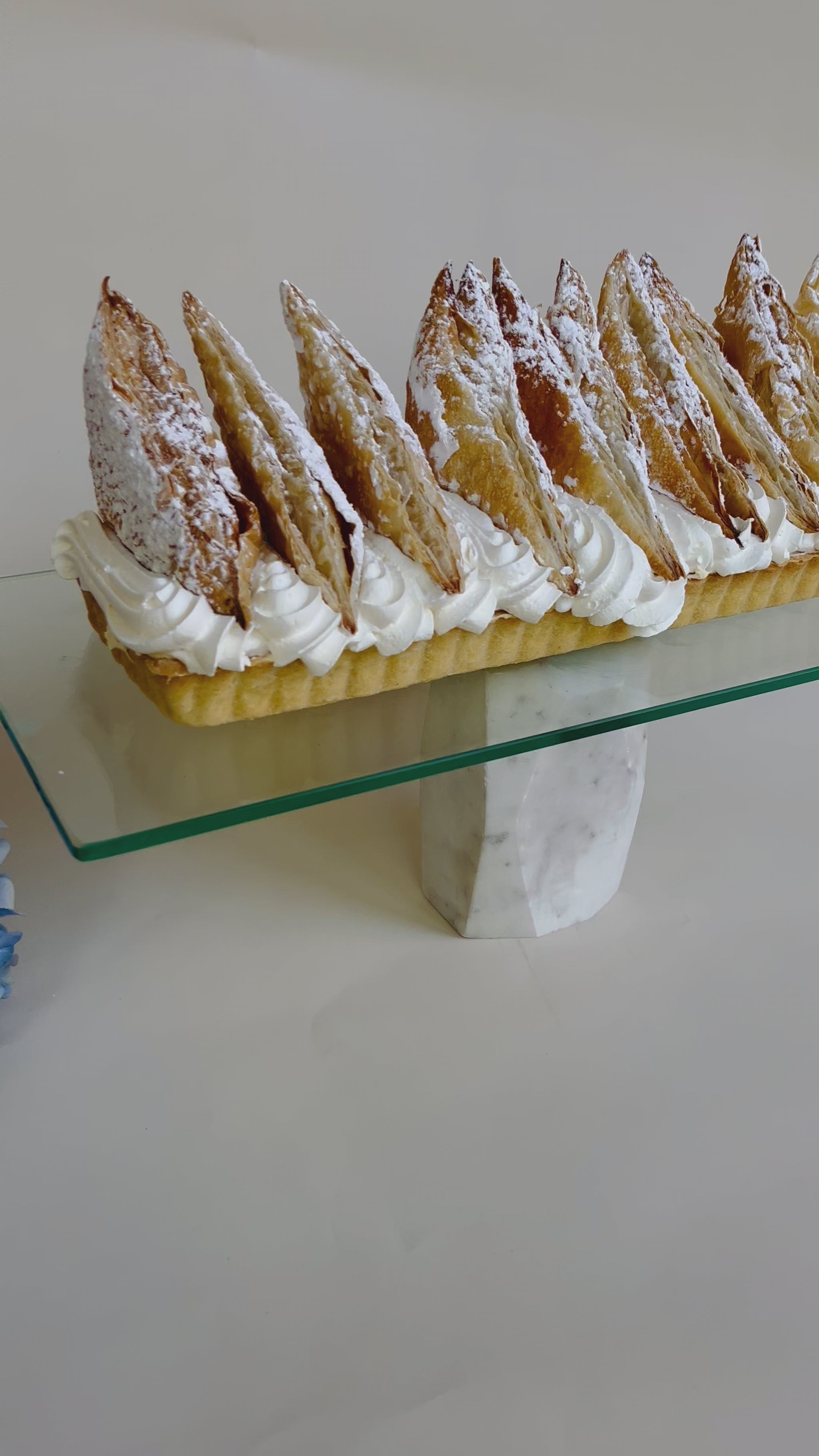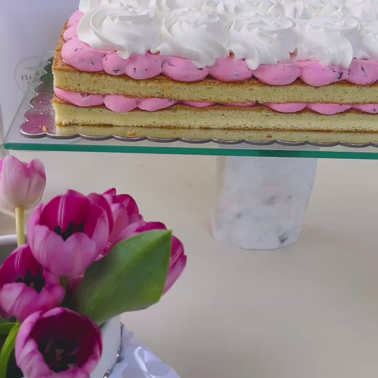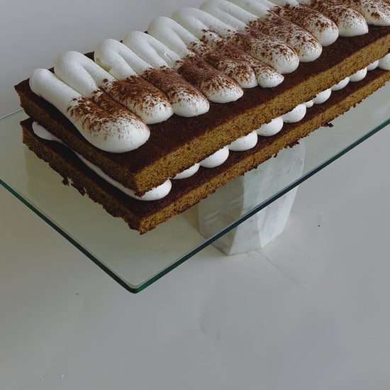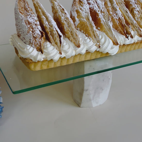Pair this beautiful glass cake stand with any log, tart, or miniatures.